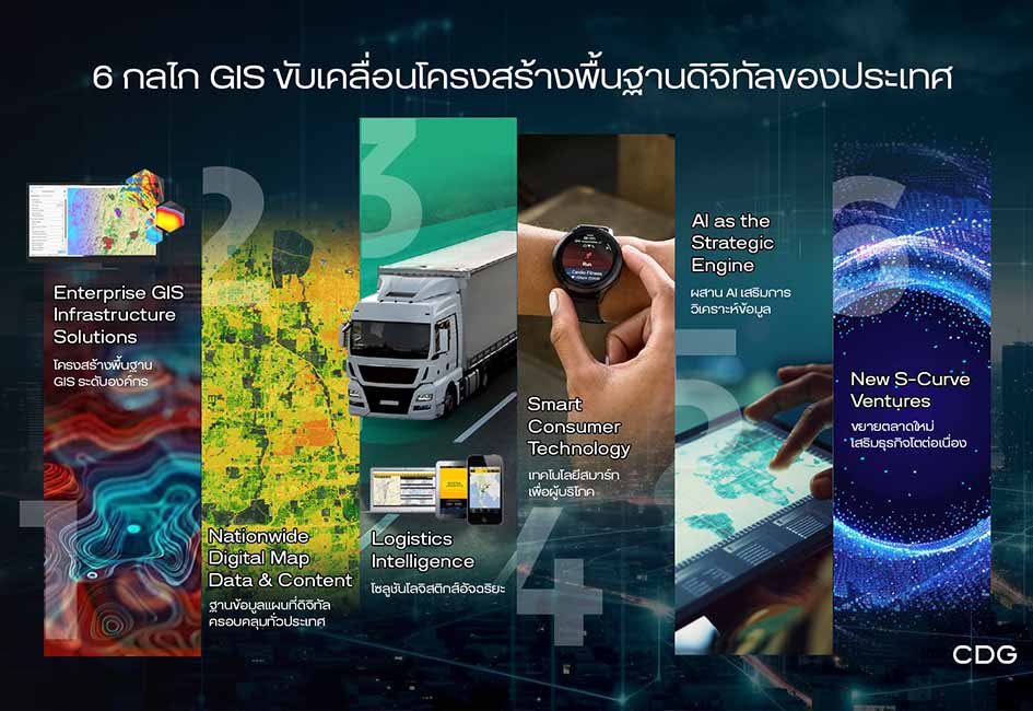 6)GIS Driver 6: New S‑Curve Ventures: ขับเคลื่อนการเติบโตระยะยาวด้วยการต่อยอดความเชี่ยวชาญด้านเทคโนโลยี GIS สู่ตลาดต่างประเทศ พร้อมขยายบทบาทสู่การเป็นพันธมิตรทางเทคโนโลยีในระดับสากล ควบคู่กับการสำรวจและพัฒนาธุรกิจใหม่ที่ต่อยอดจากศักยภาพของ GIS เพื่อสร้างโอกาสทางธุรกิจใหม่และเสริมขีดความสามารถขององค์กรในอนาคต