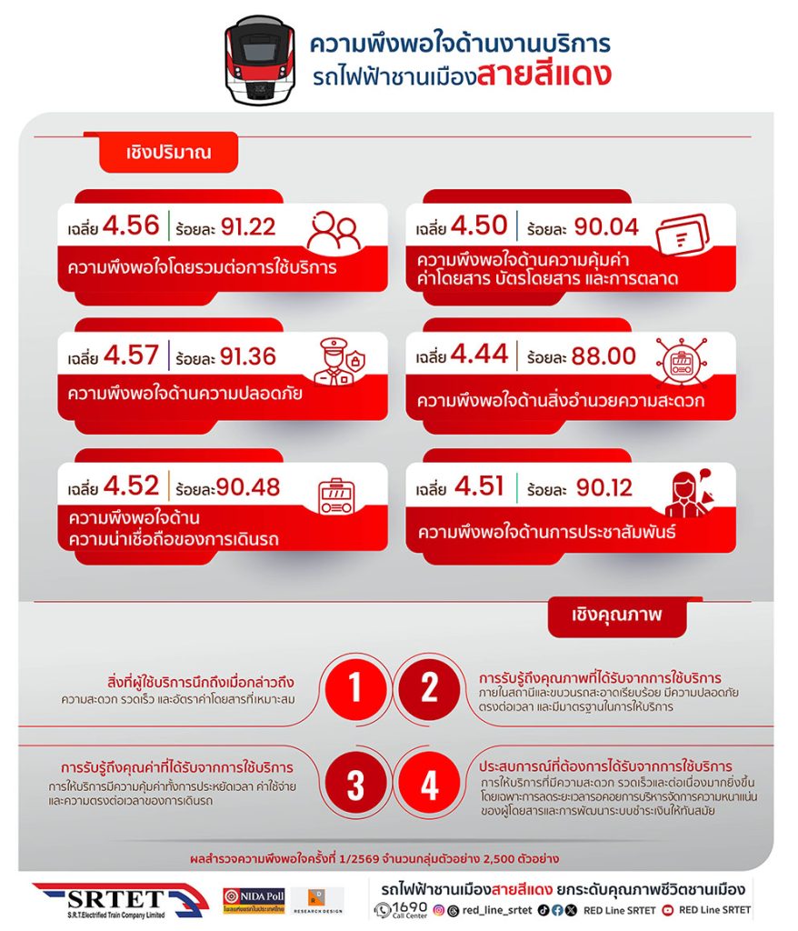 สายสีแดง เผยผลสำรวจความพึงพอใจครึ่งปีแรก ผู้โดยสารเชื่อมั่นคุณภาพบริการและมาตรฐานความปลอดภัย
