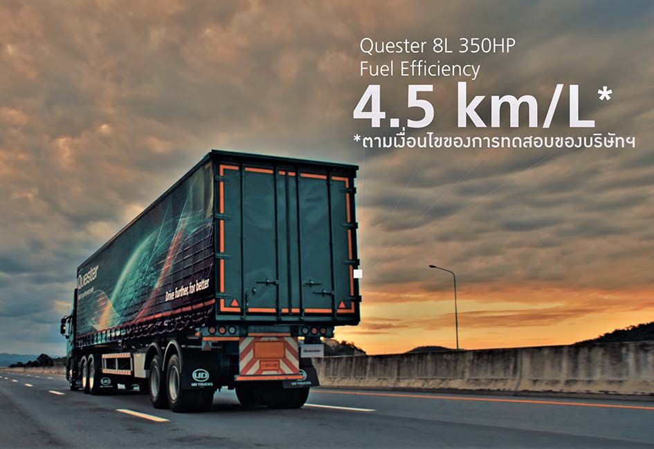 โดยเฉพาะรุ่น Quester เครื่องยนต์ 8 ลิตร กำลัง 350 แรงม้า ที่มาพร้อมเกียร์กึ่งอัตโนมัติ ESCOT เหมาะสำหรับงานขนส่งหนักทั้งในระยะใกล้และระหว่างภูมิภาค และจากผลการทดสอบอัตราการประหยัดน้ำมัน อยู่ที่ 4.5 กม./ลิตร ตามเงื่อนไขการทดสอบของบริษัท อยู่ในระดับที่น่าพอใจ อีกทั้งยังมีฟีเจอร์ใหม่ที่ช่วยสนับสนุนการทำงานของพนักงานขับรถ เพิ่มประสิทธิภาพการดำเนินงาน ความปลอดภัยปกป้องทรัพย์สินและเสริมสร้างผลกำไร เพื่อความสำเร็จอย่างยั่งยืนของลูกค้าเรา”