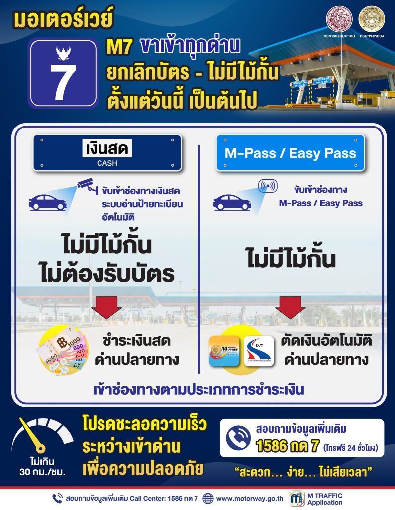 กรมทางหลวง (ทล.) กระทรวงคมนาคม โดยกองทางหลวงพิเศษระหว่างเมือง ประกาศนำเทคโนโลยีอ่านป้ายทะเบียนรถอัตโนมัติ (ALPR – Automatic License Plate Recognition) มาใช้เต็มรูปแบบ โดยช่องทางเข้าด่าน ทุกจุด “ไม่มีไม้กั้นและยกเลิกแจกบัตรผ่านทาง” บนมอเตอร์เวย์ M7 สายกรุงเทพฯ – ชลบุรี – พัทยา – มาบตาพุด เพื่อเพิ่มประสิทธิภาพการให้บริการ ให้สะดวกและรวดเร็วในการเดินทาง ลดปัญหาการจราจรติดขัดสะสมบริเวณหน้าด่านให้ดียิ่งขึ้น ผู้ใช้ทางทุกประเภทสามารถเดินทางผ่านด่านตามขั้นตอน ดังนี้