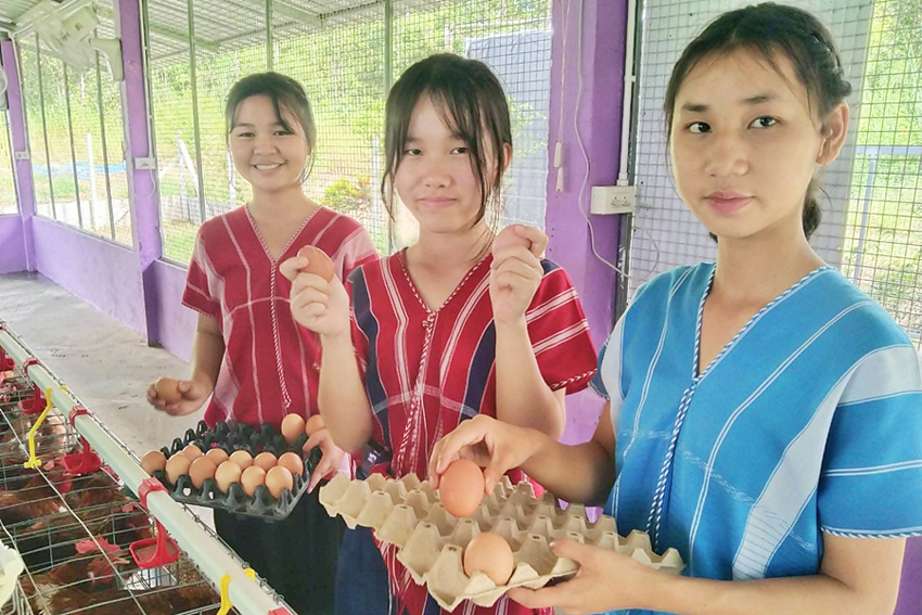 ด.ญ.วารี ชีวีอิสระ-น้องน้ำ และ ด.ญ.มณฑิตา ไพรบุญพำนัก-น้องสาวิกา ชั้น ม.2 ที่กำลังช่วยดูแลแม่ไก่ไข่ บอกตรงกันว่า “ดีใจที่ได้เรียนรู้การเลี้ยงไก่ ไข่ที่ได้ทั้งกินเอง และแจกให้ชุมชน ทำให้เราอยากสืบต่ออาชีพนี้ในอนาคต”