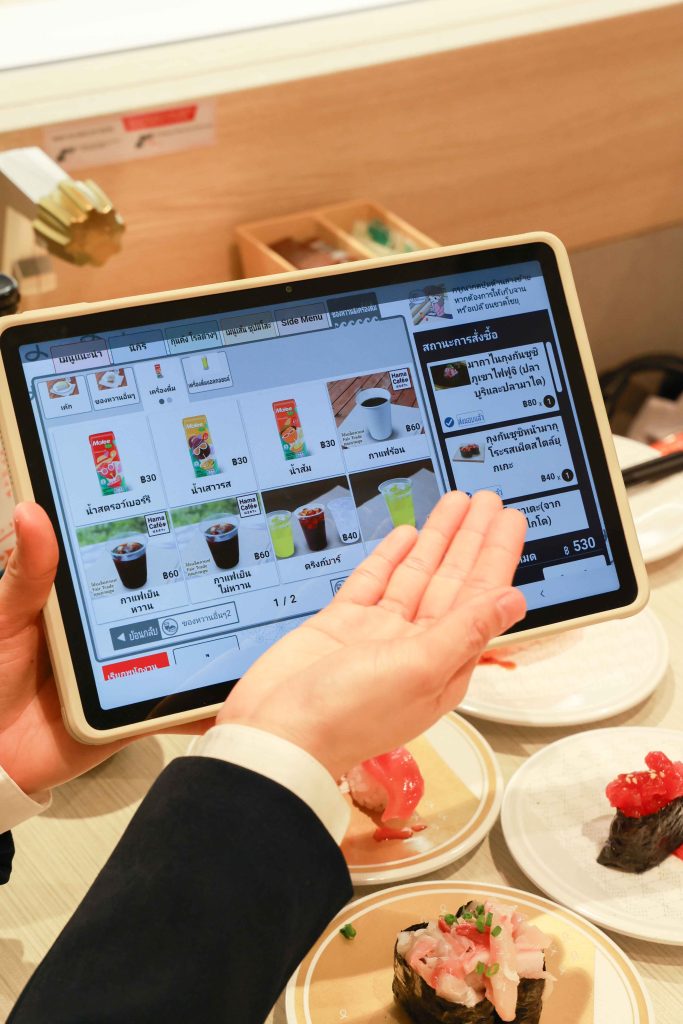 “ระบบเสิร์ฟตรงของเราถูกออกแบบมา เพื่อลด Food Waste หรือขยะจากอาหาร ได้อย่างมีประสิทธิภาพ เพราะเราเสิร์ฟเฉพาะเมนูที่ลูกค้าสั่งเท่านั้น ทําให้ทุกจานสดใหม่ที่สุด และยังเป็นการลดผลกระทบต่อสิ่งแวดล้อมด้วยโดยลูกค้าสามารถสั่งซูชิและเมนูอื่นๆ ได้อย่างสะดวกสบายผ่านแท็บเล็ตบนโต๊ะ หรือจากแถบหน้าจอ “LaneOrder” บนสายพานเสิร์ฟตรง และที่นั่งยังมีภาพเมนูไหลผ่านเสมือนซูชิสายพาน เพื<อสร้ างความเพลิดเพลินในการค้นพบเมนูใหม่ๆอีกด้วย” Mr. Tomoyoshi Nishijima กล่าว