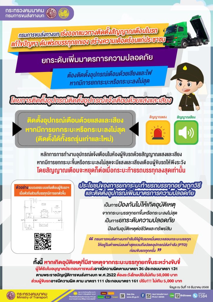 นายสรพงศ์ ไพฑูรย์พงษ์ อธิบดีกรมการขนส่งทางบก เปิดเผยว่าตามที่มีเหตุการณ์ วันที่ 18 ธันวาคม 2568 รถบรรทุกยกเท (รถดัมพ์) กระบะยกขึ้นและชนเข้ากับสะพานลอยคนข้ามถล่มลงมาทับหัวเก๋งรถบรรทุกและรถกระบะ บนถนนเทพรัตน (บางนา-ตราด) ทำให้มีผู้เสียชีวิตและบาดเจ็บ กรมฯเร่งออกแนวทางยกระดับมาตรการความปลอดภัยโดยกำหนดให้บริษัทผู้ผลิตรถ อู่ต่อตัวถังรถ ผู้ประกอบการขนส่งสินค้าและเจ้าของรถบรรทุกยกเท (รถดัมพ์) ต้องติดตั้งอุปกรณ์เตือนผู้ขับรถด้วยสัญญาณเสียงและไฟ หากมีการยกกระบะขึ้นหรือกระบะลงไม่สุด ดยหลักการการทำงานอุปกรณ์แจ้งเตือนในห้องผู้ขับรถ ด้วยสัญญาณแสงและเสียงหากมีการยกกระบะขึ้นหรือกระบะลงไม่สุดก็จะมีแสงและเสียงเตือนผู้ขับรถทำให้ผู้ขับพึงระวังและสัญญาณเตือนจะหยุดก็ต่อเมื่อกระบะท้ายรถบรรทุกลงสุดเท่านั้น