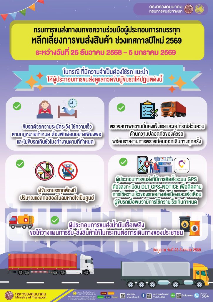 ขนส่งฯขอความร่วมมือผู้ประกอบการขนส่งหลีกเลี่ยงการขนส่งสินค้าด้วยรถบรรทุก และงดการใช้รถที่ไม่มีการบรรทุกสินค้า เพื่อร่วมเป็นส่วนหนึ่งป้องกันและลดความสูญเสียจากอุบัติเหตุทางถนน ระหว่าง 26 ธันวาคม 2568 – 5 มกราคม 2569