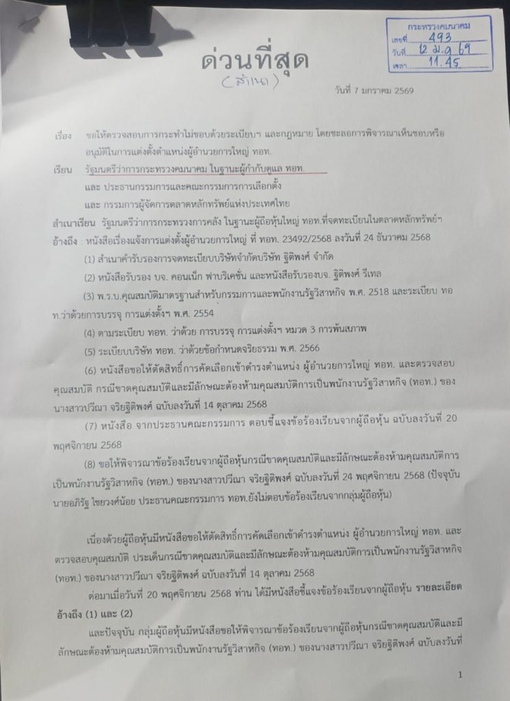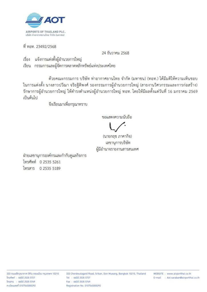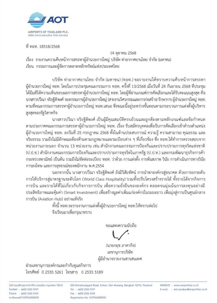 เส้นทางสู่เก้าอี้ผู้อำนวยการใหญ่บริษัทท่าอากาศยานไทย จำกัด (มหาชน) หรือ ทอท. ของ “น.ส.ปวีณา จริยฐิติพงศ์” ยังคงเต็มไปด้วยข้อครหาและข้อร้องเรียนจนถึงนาทีสุดท้าย แม้เมื่อวันที่ 24 ธันวาคม 2568 เลขานุการบริษัท ทอท. จะมีหนังสือแจ้งไปยังตลาดหลักทรัพย์แห่งประเทศไทย (ตลท.) ว่า ที่ประชุมคณะกรรมการ (บอร์ด) ทอท. มีมติเห็นชอบผลการสรรหาและแต่งตั้งนางสาวปวีณา เป็นผู้อำนวยการใหญ่แล้ว โดยให้เริ่มงานในตำแหน่งตั้งแต่วันที่ 16 มกราคม 2569 เป็นต้นไป