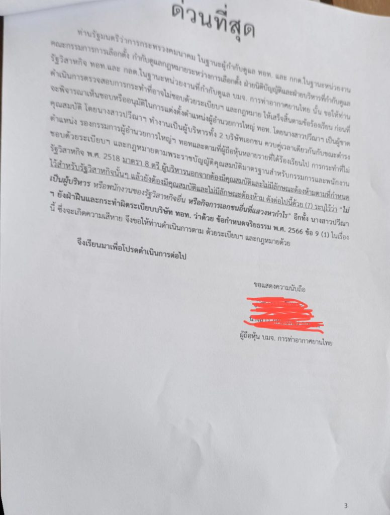 ด้วยเหตุนี้ กลุ่มผู้ถือหุ้นจึงขอให้ รมว.คมนาคม ในฐานะหน่วยงานกำกับดูแล ทอท. ให้ดำเนินการตรวจสอบอย่างรอบคอบในประเด็นดังกล่าว ที่อาจไม่ชอบด้วยระเบียบฯ และกฎหมายให้เสร็จสิ้นตามข้อร้องเรียน ก่อนที่จะพิจารณาเสนอ ครม. ให้แต่งตั้งเป็นผู้อำนวยการใหญ่ ทอท. ต่อไป พร้อมกันนี้ยังมีรายงานว่ากลุ่มผู้ถือหุ้นยังเตรียมฟ้องต่อศาลอาญาทุจริต เพราะเห็นว่าบอร์ด ทอท. มีเจตนาปฏิบัติหน้าที่โดยมิชอบ ในการละเลย หรือไม่นำพาตรวจสอบอย่างรอบคอบก่อนมีมติ ตามข้อร้องเรียนของผู้ถือหุ้นดังกล่าว