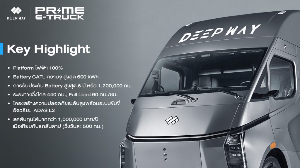 แบรนด์รถบรรทุกจากแดนมังกรเขย่าตลาดรถบรรทุกเมืองไทยอีกแล้วหลัง Prime E Truck ผู้นำโซลูชันยานยนต์ไฟฟ้าเพื่อการพาณิชย์ในไทย ผนึกกำลัง DeepWay บริษัทเทคโนโลยีรถบรรทุกพลังงานใหม่อัจฉริยะจากจีน เปิดตัวรถหัวลากไฟฟ้าอัจฉริยะรุ่นใหม่ DeepWay Star 6×4 พลิกโฉมโลจิสติกส์ไทย ชูจุดเด่นวิ่งได้ไกลกว่า 440 กม. แบตเตอรี่ CATL รับประกัน 6 ปี(1,200,000 กม.)รองรับความเชื่อมั่นลูกค้าด้วย 20 ดีลเลอร์ทั่วประเทศ สนนราคา 6,550,000 บาท มั่นใจทำยอดขาย 100 คันได้ในปีแรก